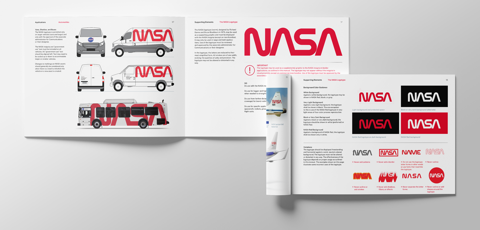 As a designer with a background in branding, it has been the honor of a lifetime to work with and be entrusted to handle one of the world's most recognizable and important brands, NASA. In 2020 I was asked to help HQ propose a solution to reintroduce the NASA Logotype (1976) back into NASA's iconic Graphic Standards Manual. Working alongside NASA's Bert Ulrich and one half of the the original "Worm" designers, Richard Danne, we came up with a solution that favored bold, large super-graphic applications and provided guidance for use and a rationale for limited use cases. This was presented to senior leadership and warmly adopted by then NASA Director, Jim Bridenstine.